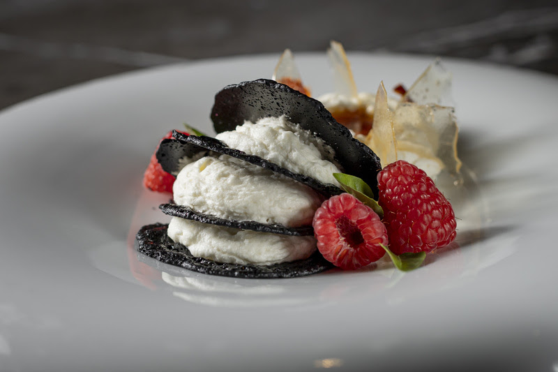 Antes da sobremesa, o pré-dessert especial: tamal de chocolate 70%, sorvete caramelizado de chocolate branco, framboesa, uma sobremesa que mistura sabores de diversos países e promete encantar os comensais. A finalização são fresas com crema de tequila, merengue de hibisco.