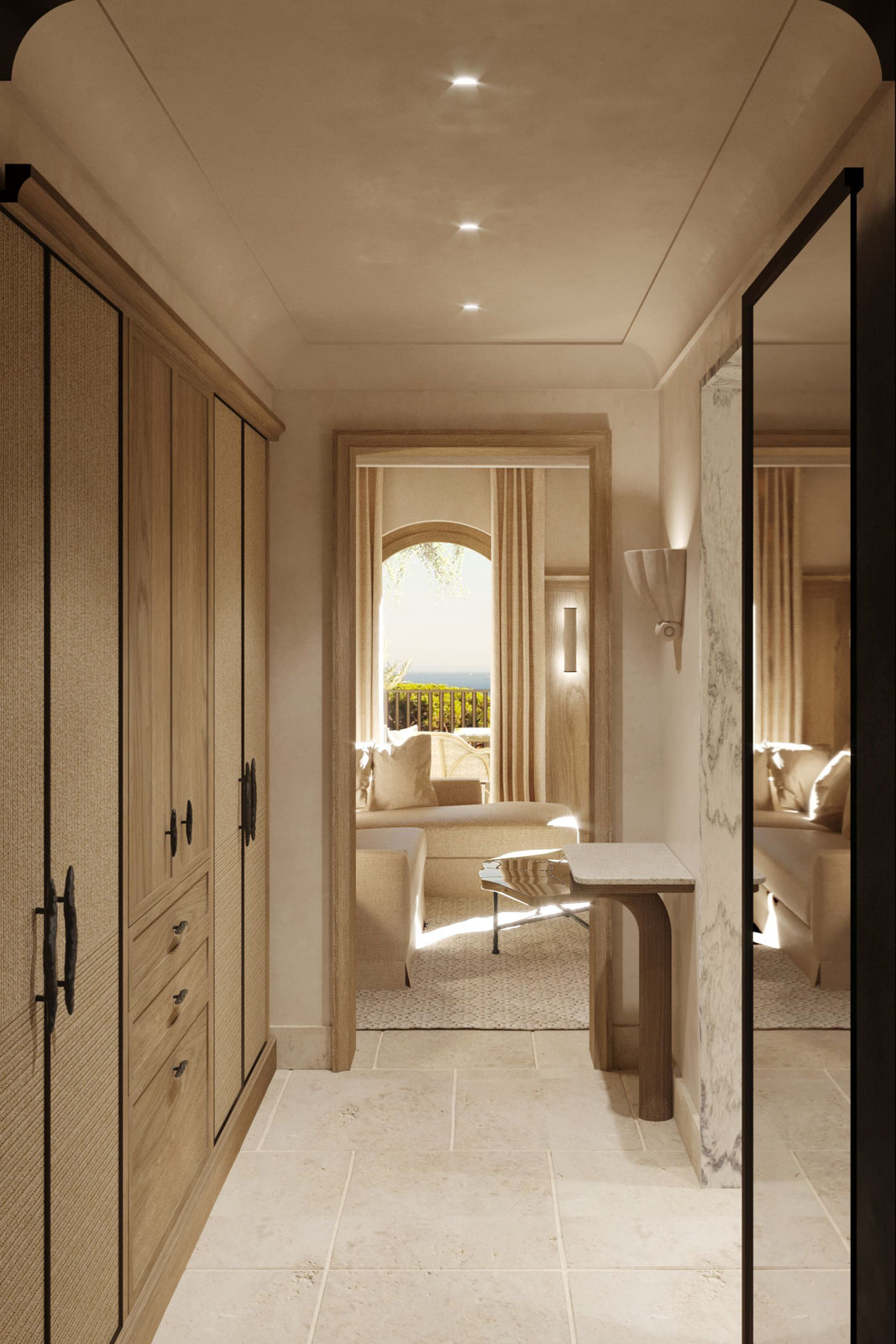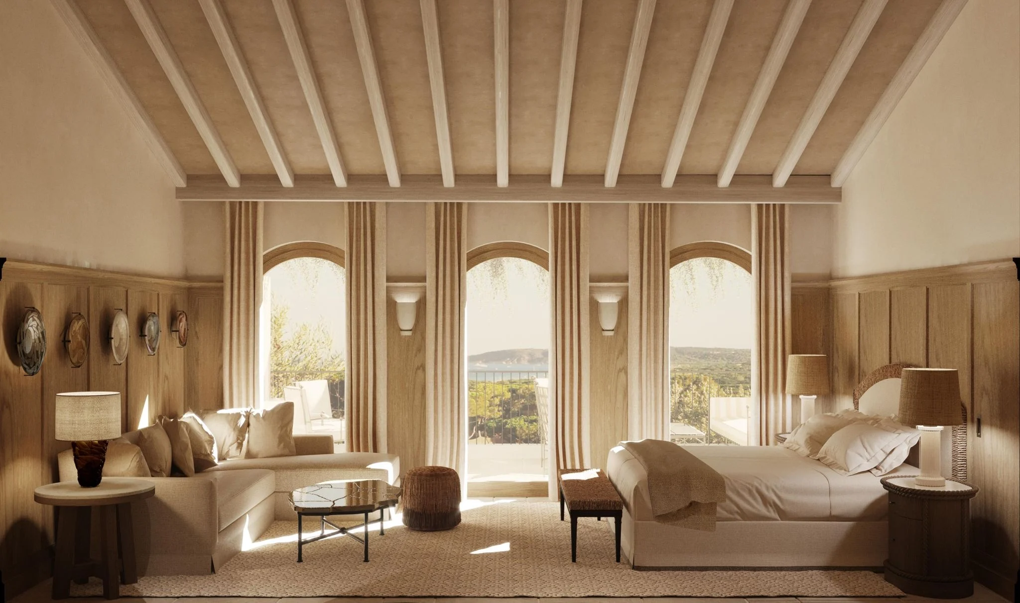 Os interiores levam a assinatura dos designers franceses Patrick Gilles e Dorothée Boissier, que buscaram inspiração na atmosfera de St. Tropez. Quartos com janelas em arco, painéis de madeira crua e cabeceiras de palha criam um ambiente acolhedor e elegante. “As tonalidades suaves de Saint-Tropez, como ocres quentes e rosas delicados, dialogam com os telhados vermelhos iluminados pelo sol, criando um equilíbrio entre simplicidade rústica e sofisticação”, descreve Boissier.