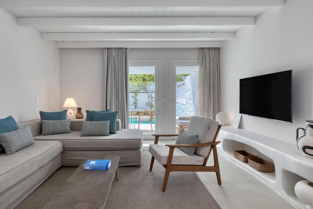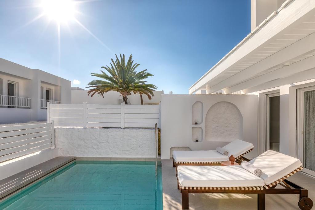 Projetado originalmente pelo renomado arquiteto Miltos Dallas na década de 1960, o hotel passou por uma transformação liderada pela arquiteta brasileira Patricia Anastassiadis. Inspirada na tranquilidade da ilha e em suas tradições culturais, Anastassiadis renovou o espaço com texturas naturais e uma paleta de tons brancos, creme e azul, criando uma atmosfera que harmoniza o design contemporâneo com a herança local.