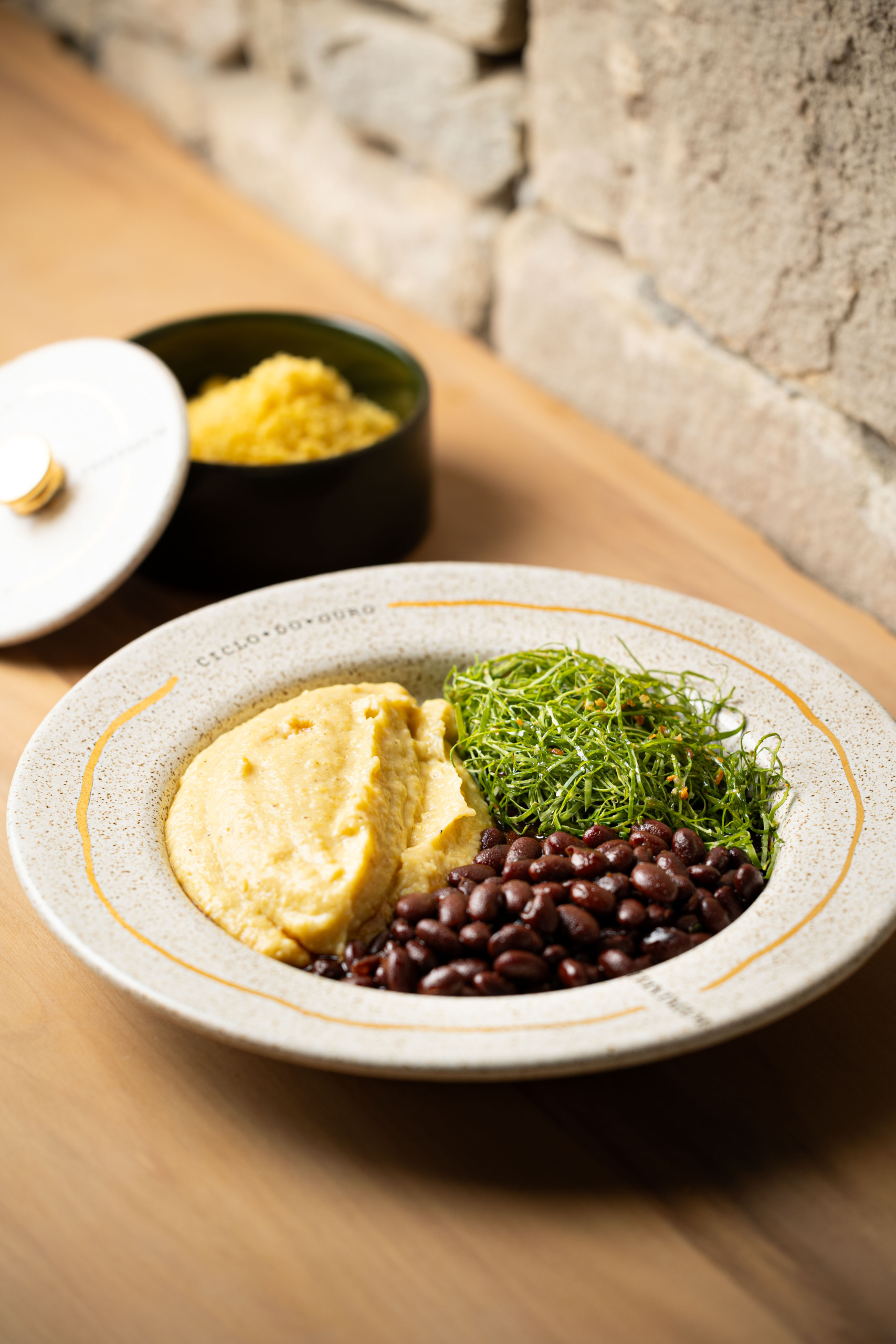 A experiência começa logo na recepção, com a cortesia Mentira de Polvilho, um crocante típico que simboliza a hospitalidade mineira. Em seguida, os tira-gostos autorais convidam ao compartilhamento e exploram ingredientes regionais de forma criativa. Entre eles, o Pastel de Angu recheado com umbigo de banana e requeijão de raspa, o Bolinho de Feijão Fradinho com molho caipira picante e o Jiló recheado com fígado empanado na pururuca.