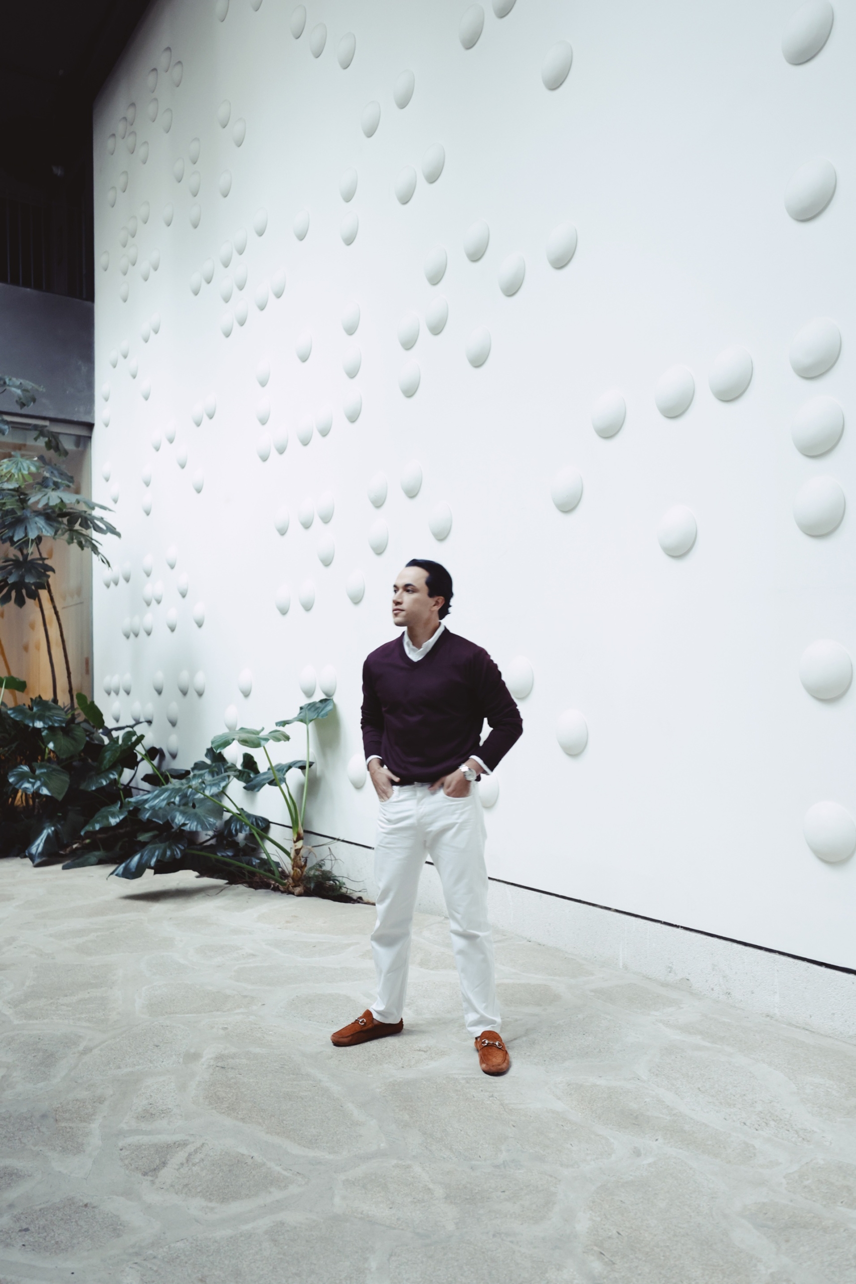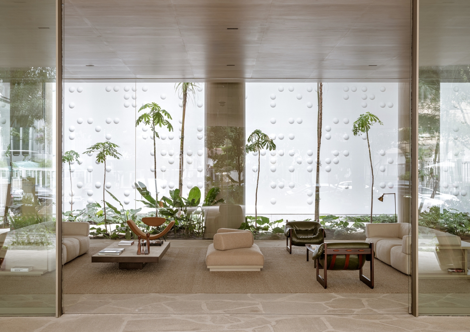 Um extenso painel de 30 metros recebe os visitantes do Pulso Hotel, é a obra “Mácula” (2023), de Nuno Ramos, um elemento marcante do lobby. Posicionada no jardim interno, em que uma divisória de vidro garante iluminação natural e a presença de vegetação nos interiores do hotel, a obra causa impacto e confere ao espaço uma atmosfera sem igual.