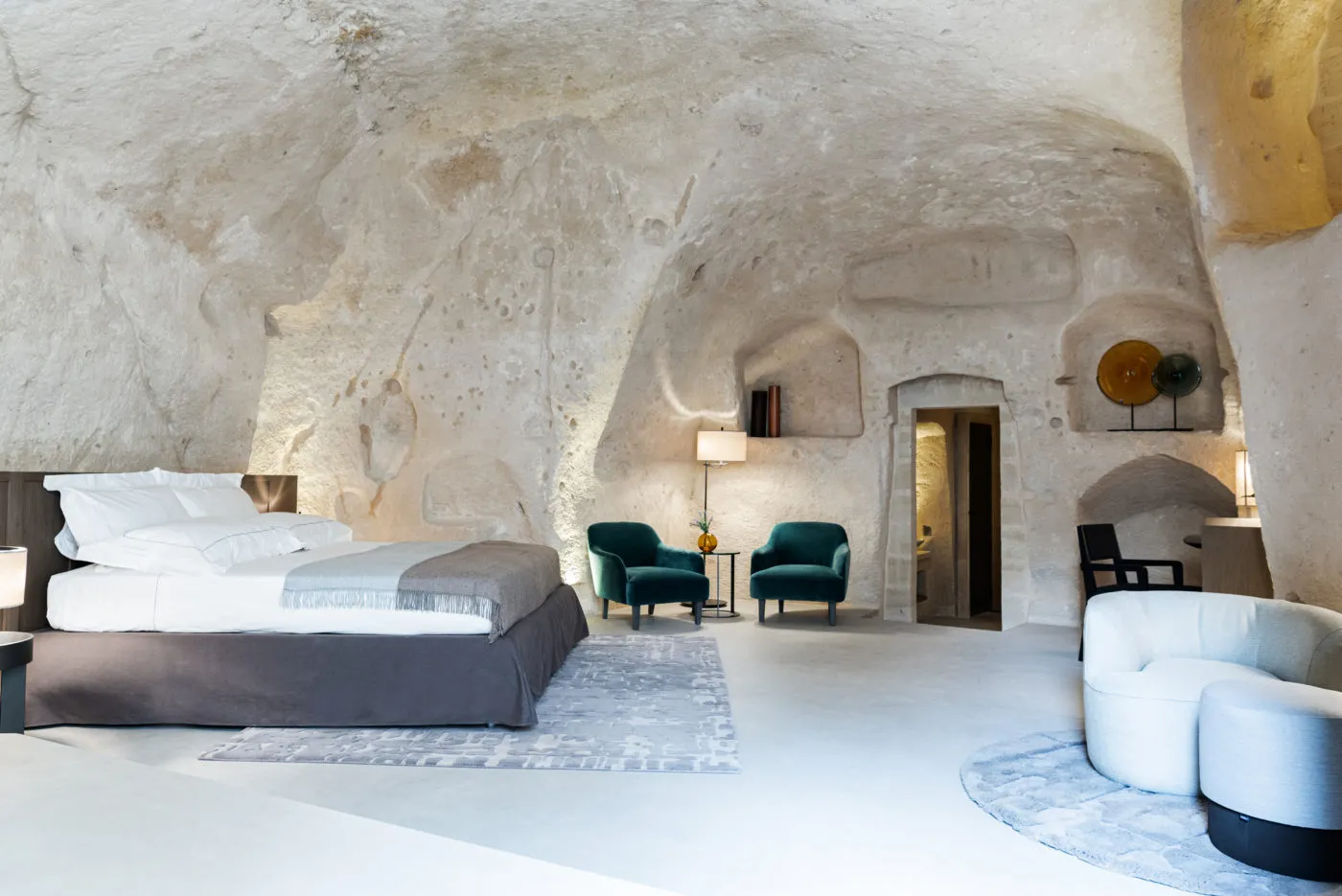 O curioso é que nada ali parece forçado. Pelo contrário. O Vetera respeita cada camada do passado e entrega uma experiência genuína. As paredes continuam ásperas. Os nichos escavados continuam visíveis. Mas agora abrigam luminárias suaves, móveis de design italiano e, em alguns quartos, piscinas internas privativas, daquelas em que a água parece tocar a própria rocha. A atmosfera é íntima, quase silenciosa. E, a essa altura, difícil não se perguntar como a cidade foi esquecida por tanto tempo!