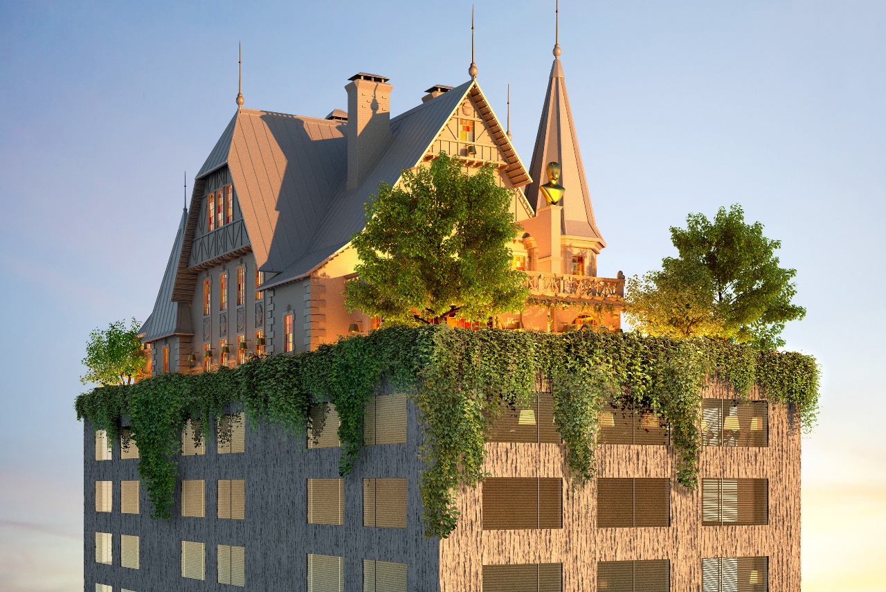 O projeto, concebido inteiramente pelo designer francês, não nasceu apenas de desenhos técnicos ou referências arquitetônicas. Ele parte de uma narrativa inventada por Starck, reunida no livro “A Vida Meticulosa de Manfred Heler”. Nesse enredo, o protagonista herda a casa dos pais, isolada num grande parque. Um dia, a terra treme, e a mansão – junto com o jardim, a poltrona e o próprio Heler – começa a subir. Sobe até que o movimento cessa, deixando-a suspensa sobre a cidade, como se um cortador de biscoitos tivesse recortado o pedaço de terra e encaixado verticalmente no horizonte.