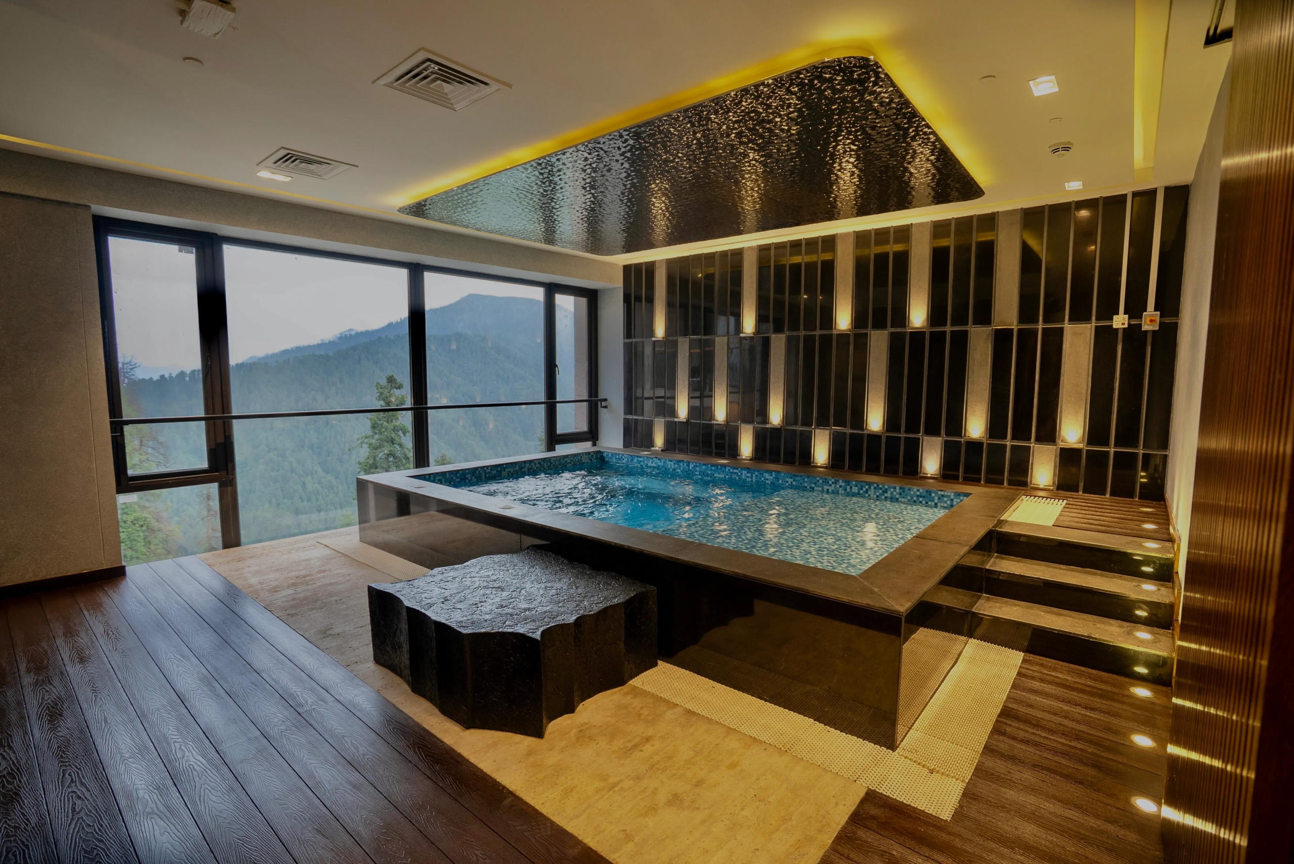 O bem-estar é um dos pilares do novo hotel. O spa reúne terapias holísticas e massagens exclusivas, enquanto a academia de última geração complementa a experiência. Já a piscina coberta infinita, com paredes de vidro do chão ao teto, permite mergulhos com vista panorâmica para os picos nevados… um diferencial raro na hotelaria da região.