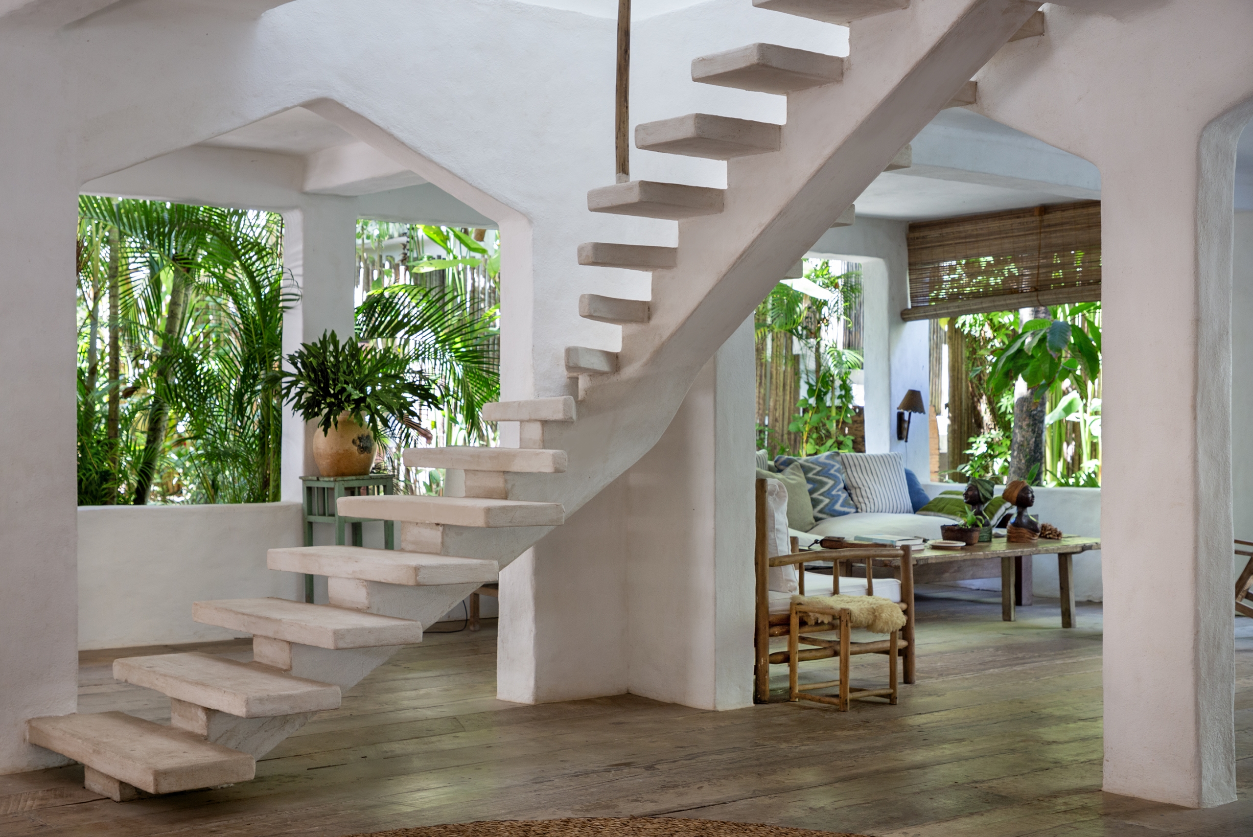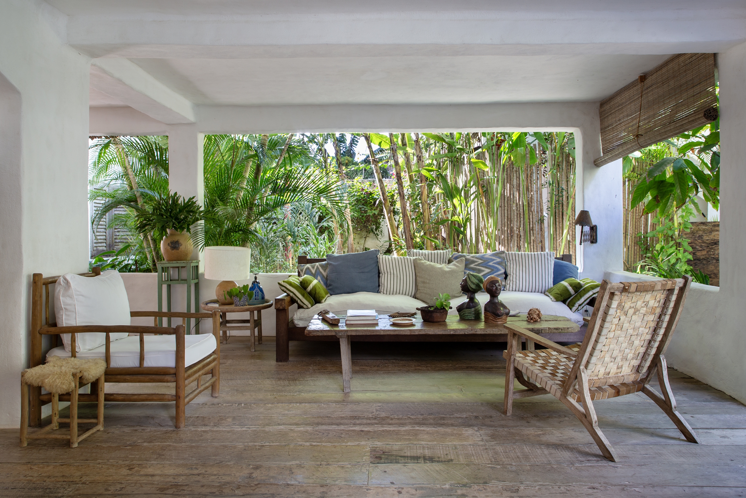 Com projeto do artista José João Calazans (Calá) e da arquiteta Nadia Kulesis Allegretti, a casa segue o estilo “mediterrâneo caboclo”, que mistura referências gregas ao artesanato local. O projeto privilegia integração com a natureza, ventilação cruzada e materiais naturais, mantendo o espírito rústico e elegante que caracteriza o Quadrado de Trancoso.