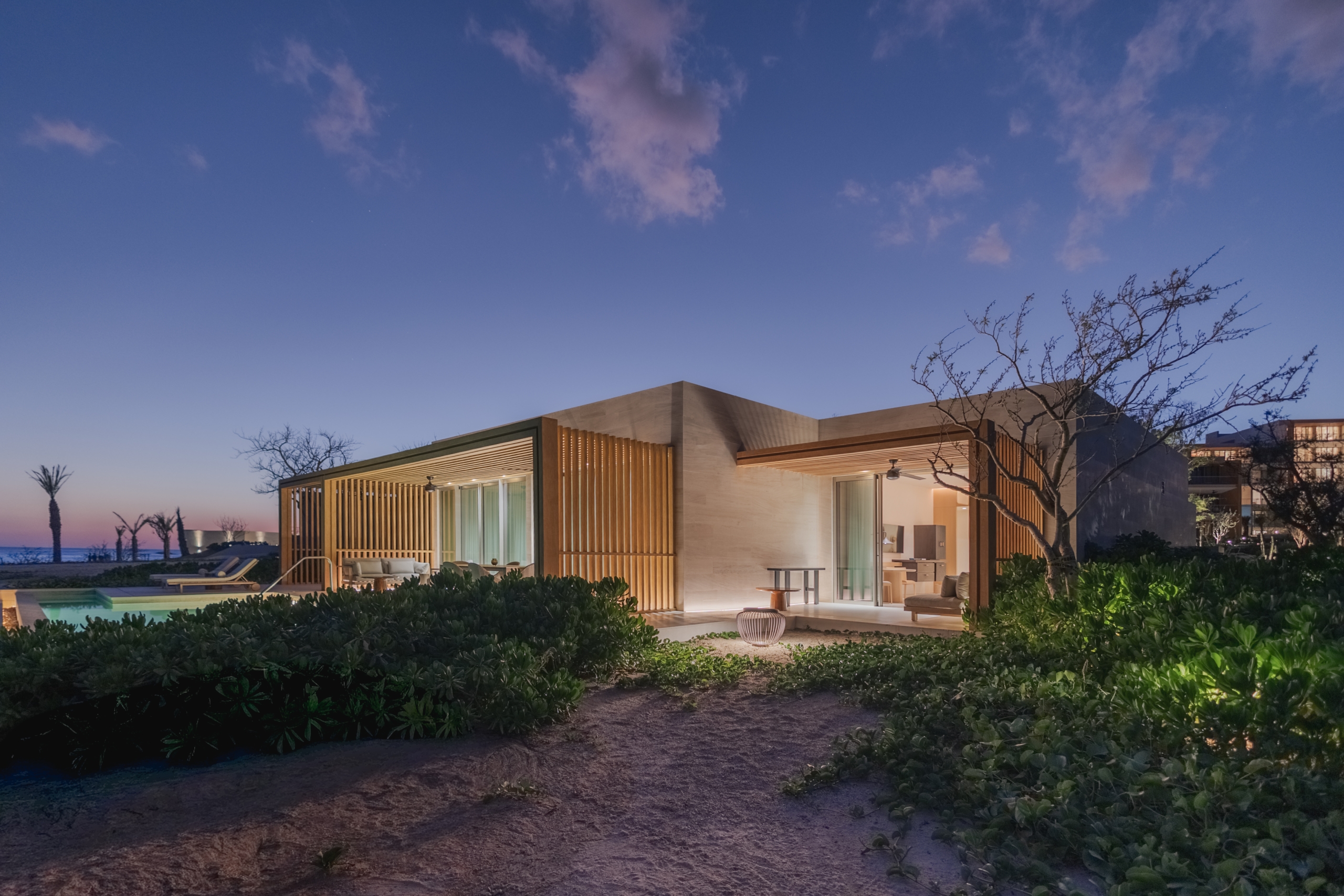 Assinado por escritórios renomados como Sordo Madaleno, Paulina Morán, George Wong Design e com conceito criativo da Yabu Pushelberg, o projeto arquitetônico se inspira em elementos clássicos da arquitetura mexicana como pátios, arcadas e o uso da água reinterpretados de forma contemporânea. Materiais naturais, texturas sutis e uma paleta de cores clara criam uma atmosfera residencial e silenciosa, pensada como um verdadeiro refúgio à beira-mar.