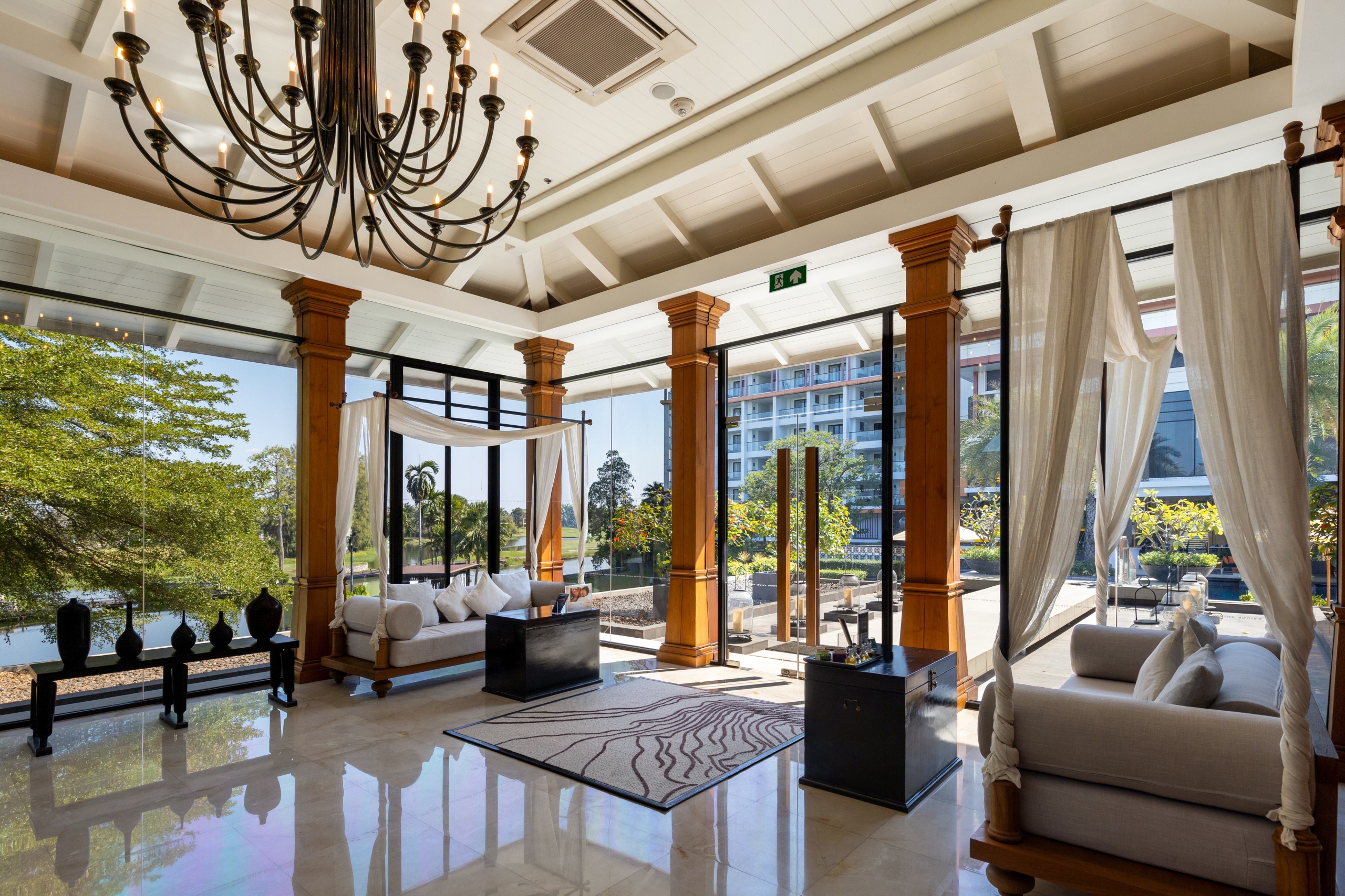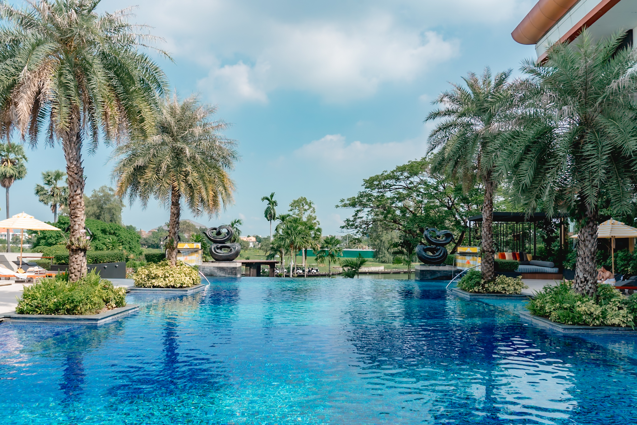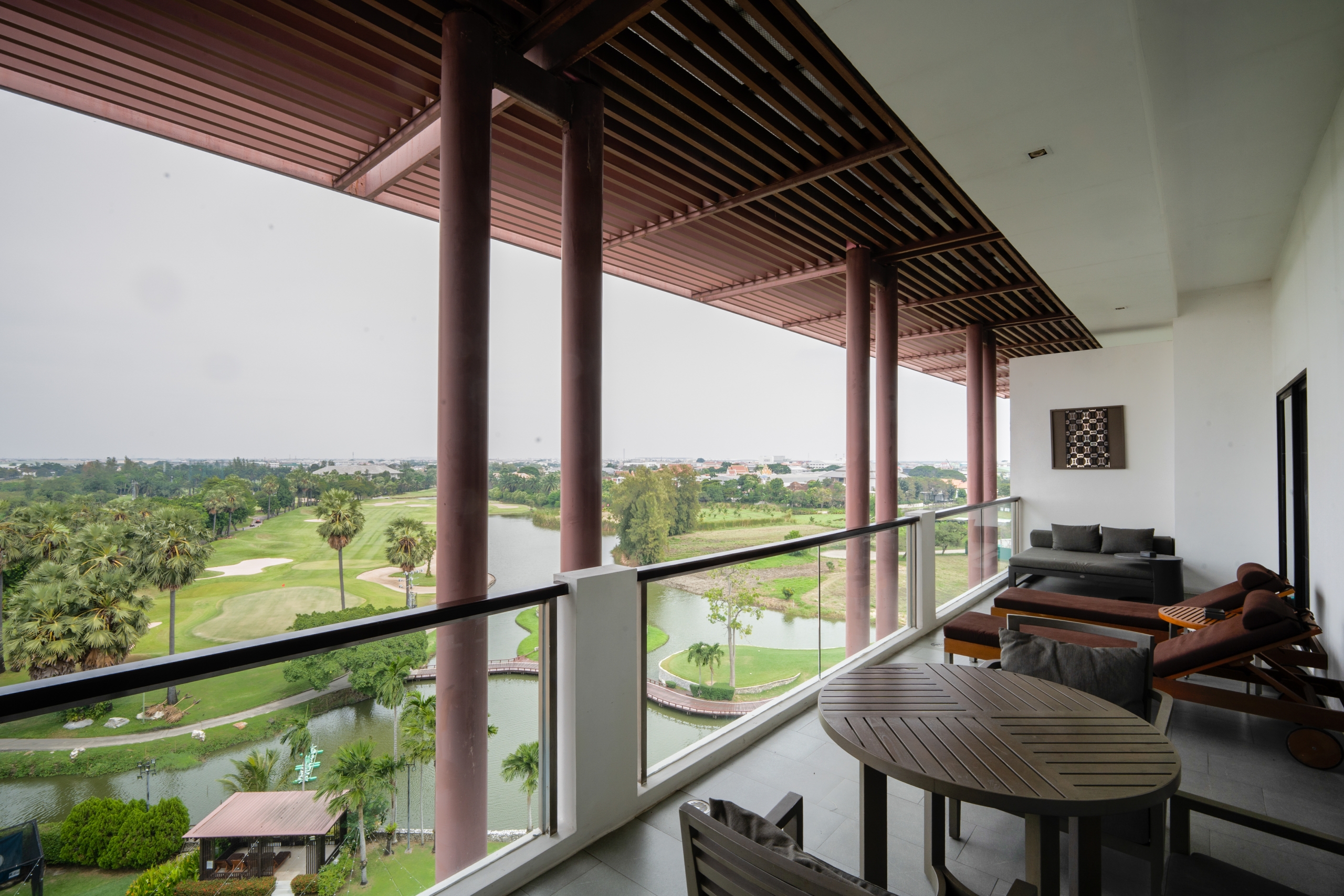 Instalado a cerca de 15 minutos do Aeroporto de Suvarnabhumi, o hotel ocupa uma área que cresce silenciosamente no leste de Bangkok, fora do radar turístico tradicional. Entre as vias expressas, centros logísticos e novos polos residenciais, o resort se ancora no Summit Windmill Golf Club, um campo de 18 buracos que define a paisagem e ajuda a explicar a proposta do empreendimento.