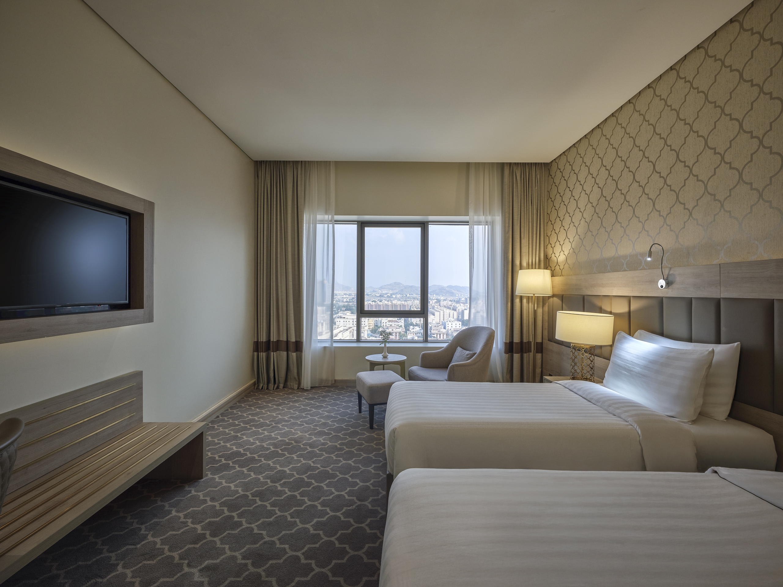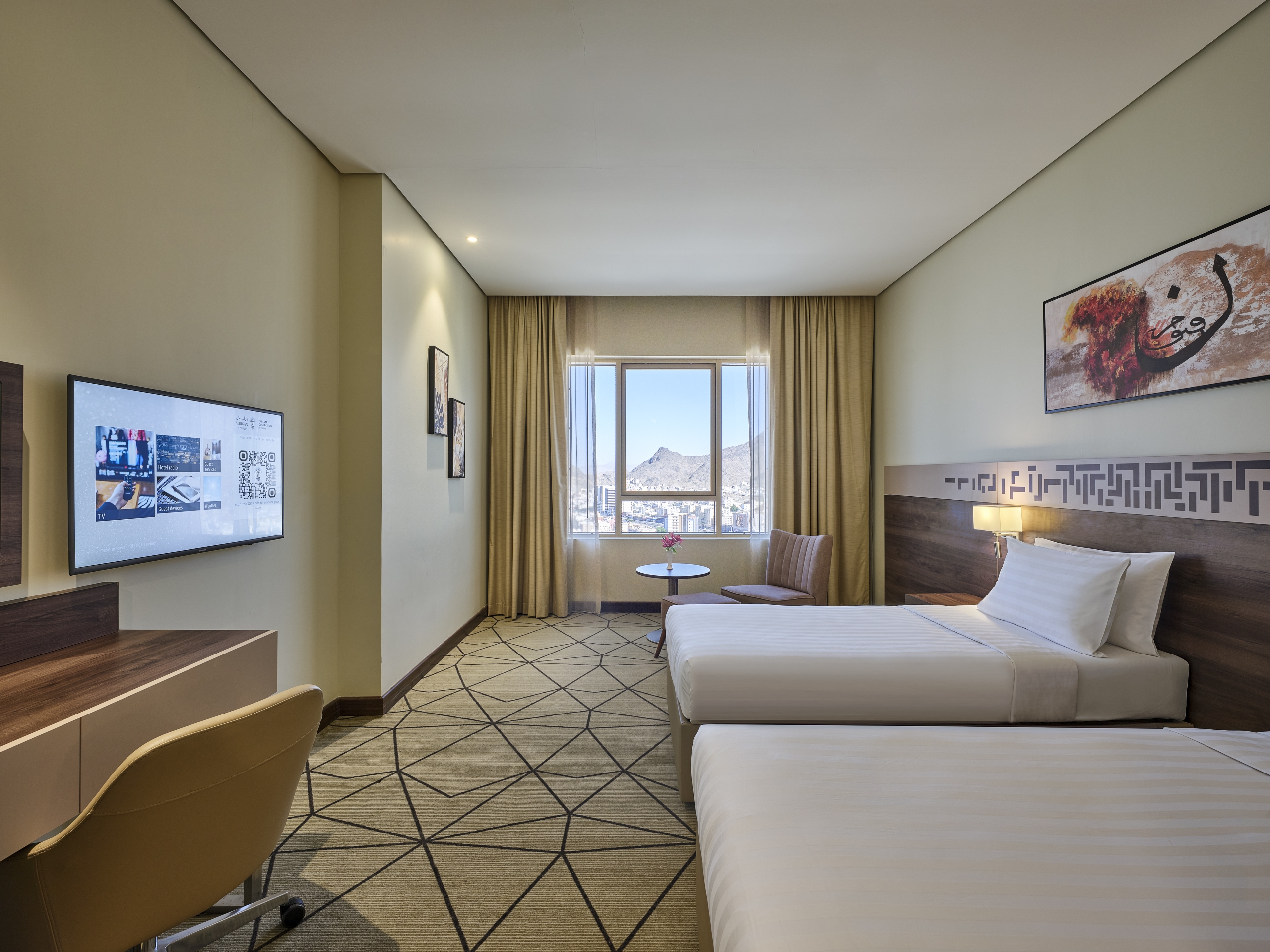 Já o DoubleTree by Hilton Makkah Aziziyah se insere em um contexto um pouco diferente. Instalado na área leste do distrito de Al Aziziyah, fica a cerca de cinco minutos da Mesquita Sagrada e também próximo à Caverna de Hira. Com menos quartos, o hotel reforça o padrão de hospitalidade característico da marca, incluindo o tradicional cookie de chocolate servido na chegada, e mira tanto o fluxo religioso quanto hóspedes que buscam uma estadia funcional, com restaurante all-day dining, cafeteria no lobby, academia e salas de reunião flexíveis.