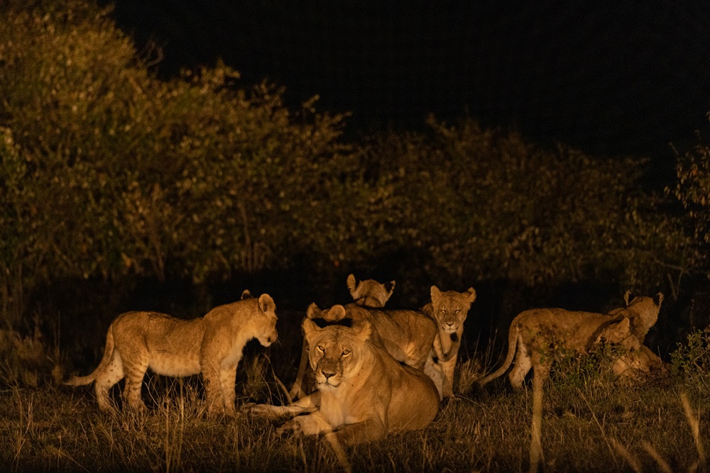 Ao entardecer, o ar esfria, os sons mudam e a vida selvagem, antes adormecida pelo calor do dia, desperta com uma energia silenciosa, porém intensa. Os safáris noturnos no Mahali Mzuri permitem testemunhar esse outro ecossistema: hienas caçando em matilha, leopardos à espreita, corujas em voo, leões e seus filhotes descansando após um dia de caçada. A escuridão, acompanhada por guias Maasai que leem a terra como um livro aberto, torna-se uma aliada da experiência.